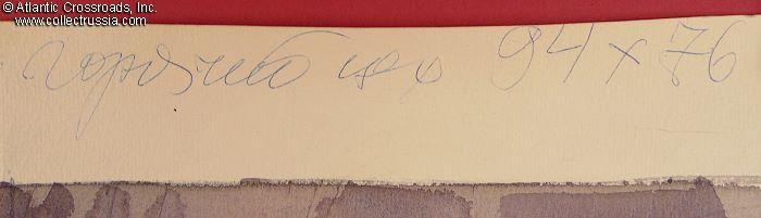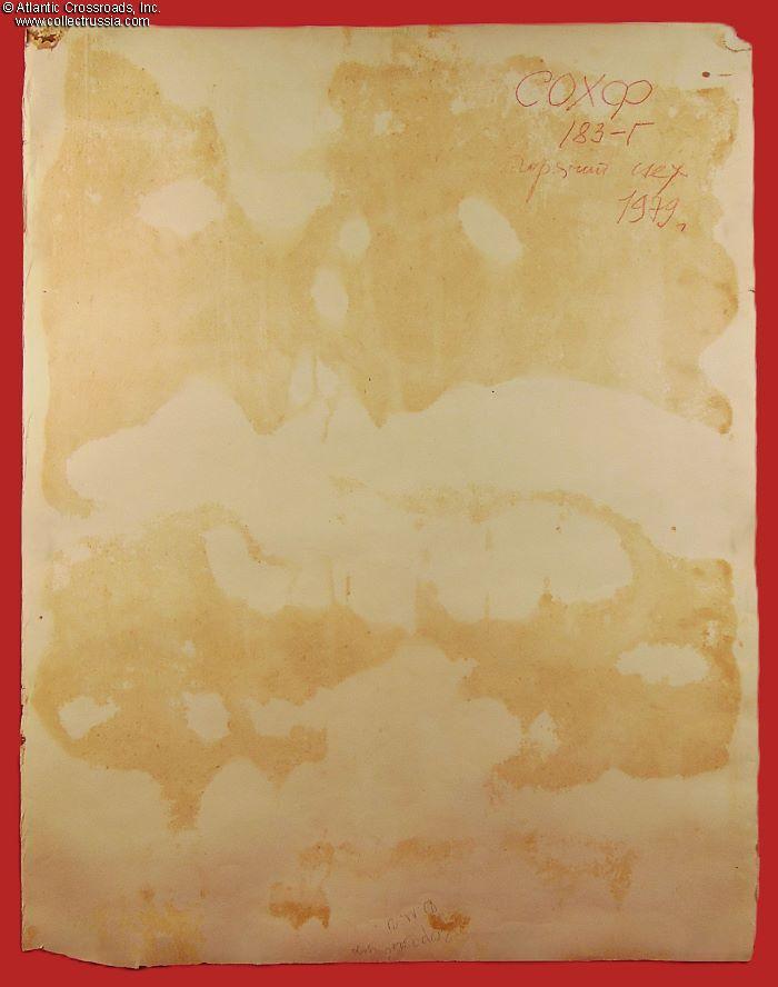 The image measures 23.5" x 29.5", total size is 26" x 34". Judging by the measurement on the verso in his own hand, 94 x 76 cm, (37" x 30"), this painting could be a study for a somewhat larger finished painting. The watercolor is signed by the artist with his last name and initials at the bottom of the obverse. Another notation in his hand, in red pencil, says that this work was kept at СОХФ (Russian abbreviation for Sverdlovsk Regional Artists' Fund), and states its title "Hot Workshop" and date, 1979. "Hot workshop" is a commonly used synonym for "f