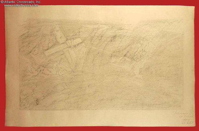 Large format: the image measures 26 ½" x 14 ½", total size is 31" x 19 ¾". The lone figure of a worker is completely dwarfed by the huge machinery rumbling through its unstoppable toil in the dead of the night. Even though the man is in the only brightly lit spot, he is not the focal point of this artwork. The mammoth scale of the industry around the man is the hero of this piece of art. The inscription in the artist's hand in the lower left-hand corner under the image reads "In the quarry. Night shift. Linotype." His hand signature and year is in the opposite corner under his initials and year incorporated into the linotype. The inscription on the verso was made by an employee of the Sverdlovsk Regional Artists' Fund when registering the linotype in their inventory. It reads "Novichenko V.A. Price 300 rubles, SRAF, inventory #124-G."