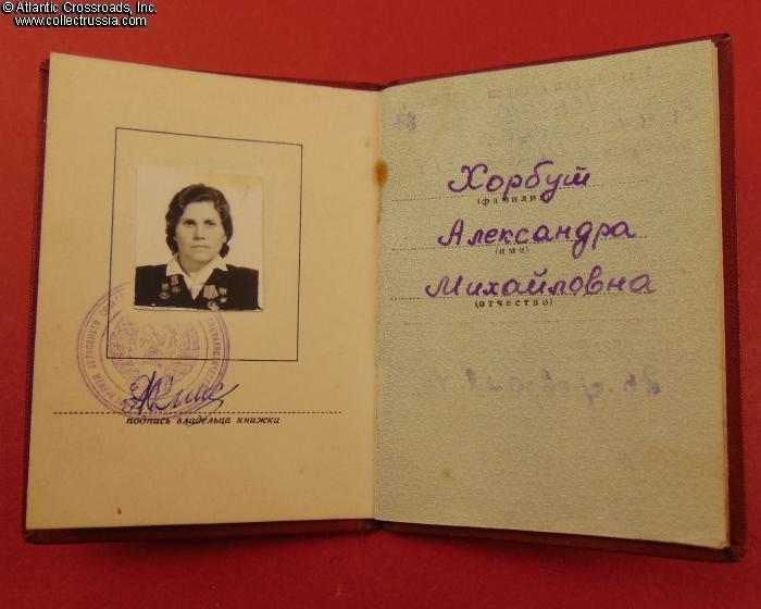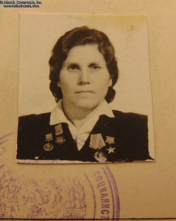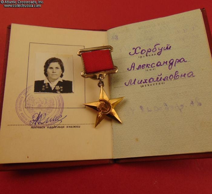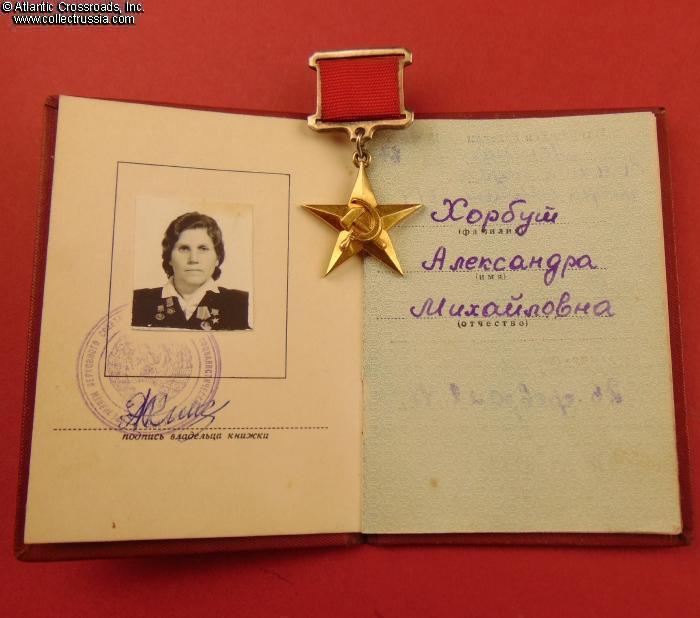 Research Materials: photocopy of the relevant page from the serial number reference guide Heroes of Socialist Labor by Vadim Latysh, C. 2020, Moscow (which further confirms the identity of the recipient). A biography of Aleksandra Khorbut and a photo of her at a young age are available on a number of Russian-language websites such as https://warheroes.ru/