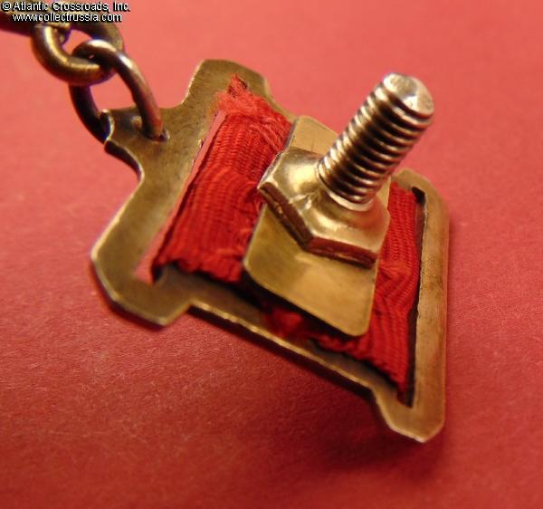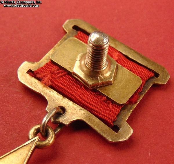 The suspension is original and complete, including the rectangular back plate, hexagon retaining nut, and an appropriate early-style screw plate with the mint logo. All parts of the suspension have a matching amount of the original gold plating. The perfectly preserved, clean old ribbon appears to be of the period and is probably original to the medal. The silver connecting link likewise appears to be original; its ends are still joined with solder.