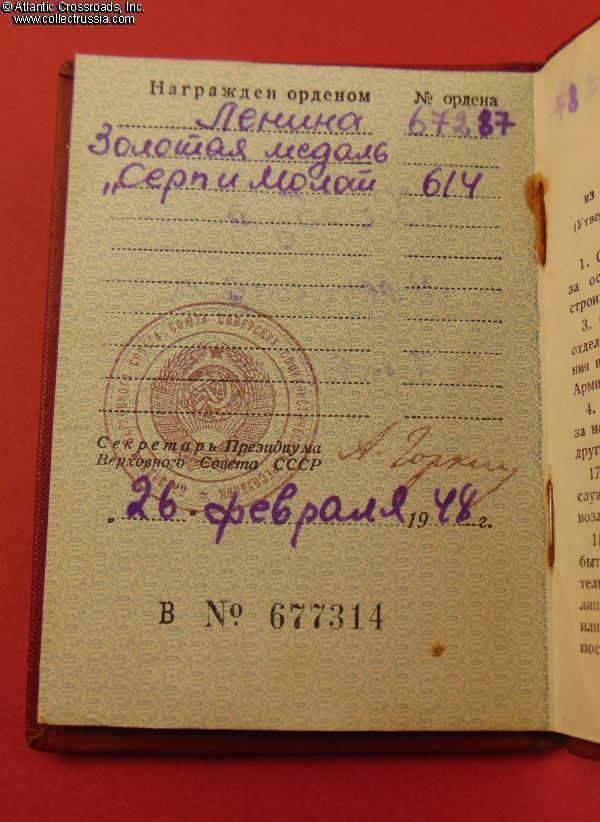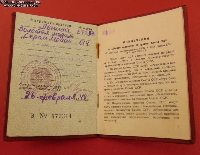 Gold "Hammer and Sickle" Medal, Type 2, Variation 1, #614, with award document (order booklet), awarded on 16 February 1948 to Aleksandra Khorbut (Александра Михайловна Хорбут), a collective farmer in Western Ukraine, for achieving an outstanding harvest of sugar beets during the previous year.