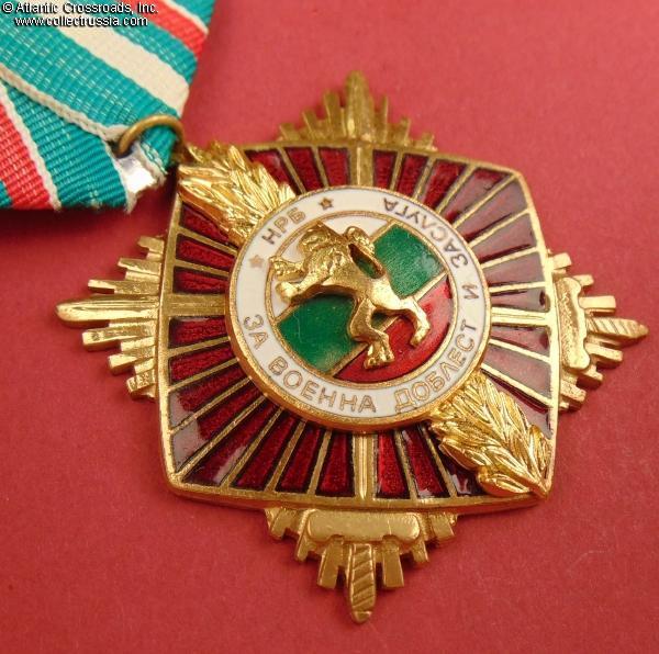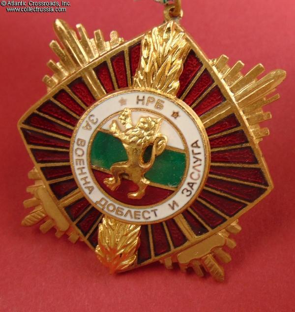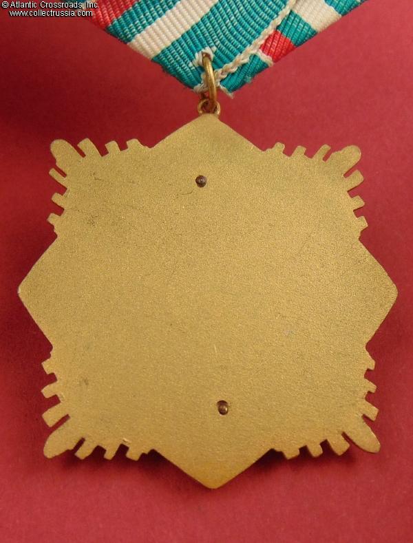 The decoration is in brass and enamels; its medallion is of massive riveted three-piece construction, measures 48.1 mm in height including the eyelet, 45.6 mm in width; weighs 43.4 g not including the suspension. The gold lion in the center is a separate piece superimposed on the center medallion consisting of a gold ear of wheat and disc with red, green and white stripes of enamel representing the national flag of Bulgaria; the latter is in turn superimposed on the enameled red square with gold sunburst and swords.