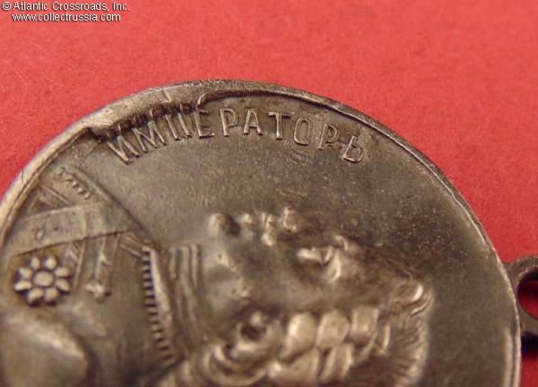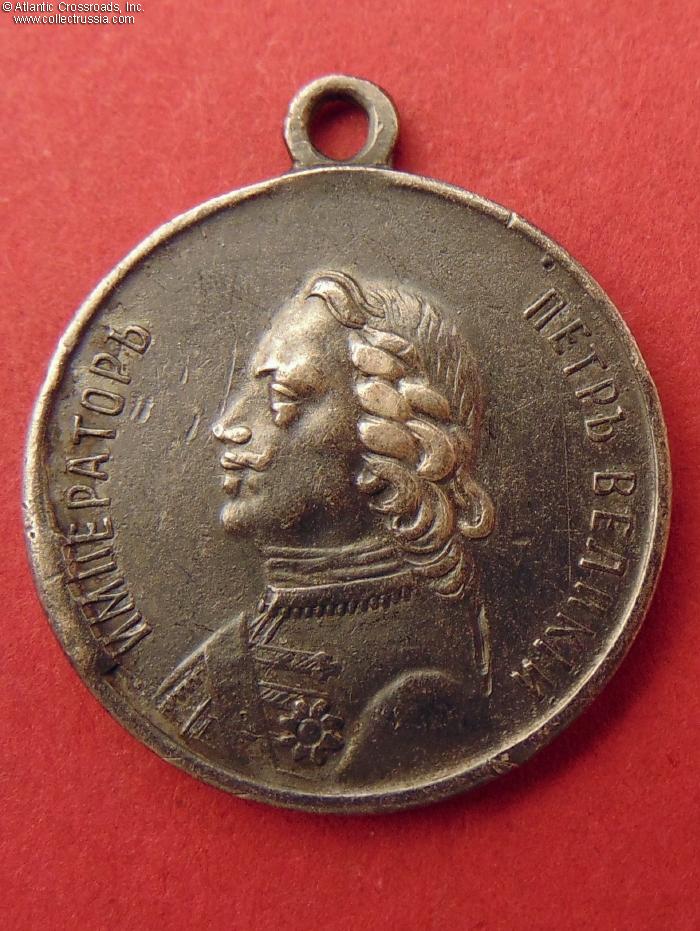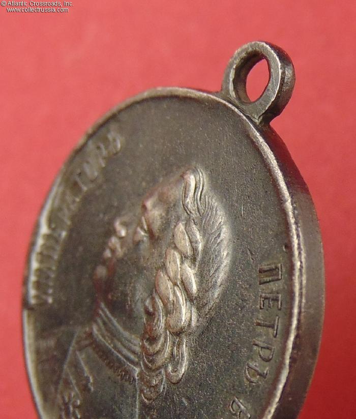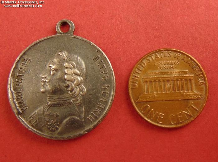 In silver; measures 28.2 mm in height incl. eyelet, 24.5 mm wide; weighs 6.7 g. The obverse features a portrait of Peter I, the founder of the city, and inscription "Emperor Peter the Great". The reverse has the St. Petersburg's coat of arms of crossed anchors and scepter, banners topped with double-headed eagle, and raised inscription "In Commemoration of the 200th Anniversary of the of St Petersburg, 1703-1903.