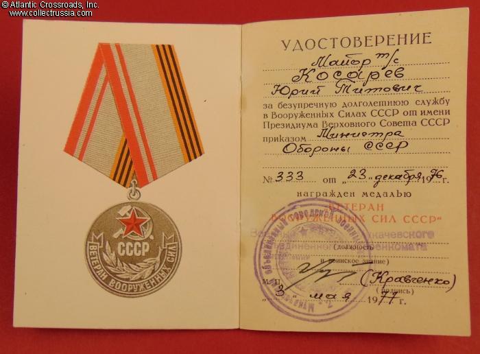 The certificate was issued on 22 February 1962 and initially had an entry for the 2nd cl. Long Service Medal bestowed on 17 January 1962. Kosarev's rank at the time was technical service major. The document is signed by Major General Pavlov, Commander of the Military Unit #11326 where the recipient was serving at the time, and shows the unit stamp. As was standard procedure, the next higher service award - i.e. the 1st class medal - was added to the document later when the recipient became eligible for it five years later, on 18 January 1967. There is no entry or stamp mentioning the unit for the latter entry.