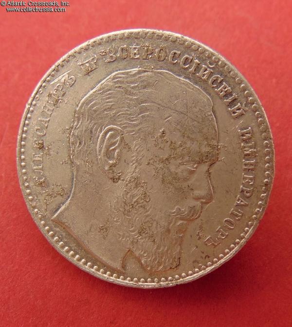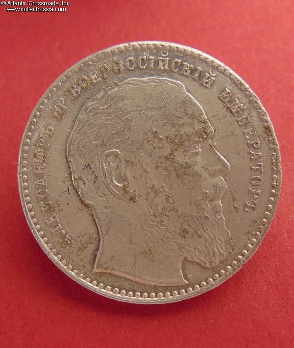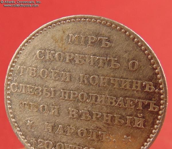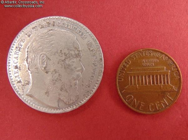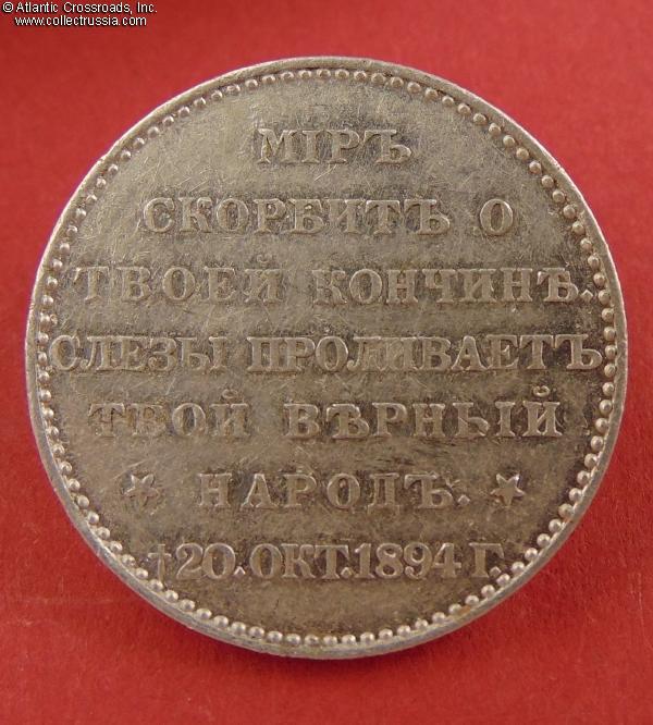 In aluminum, measures 27.9 mm in width; weighs 2.4 g. The obverse has a bas-relief portrait of the late emperor and inscription "Alexander III, Emperor of All Russia". The reverse bears an inscription "The World is Grieving over Your Demise; Your Loyal Nation is Weeping. 20 Oct(ober) 1894".