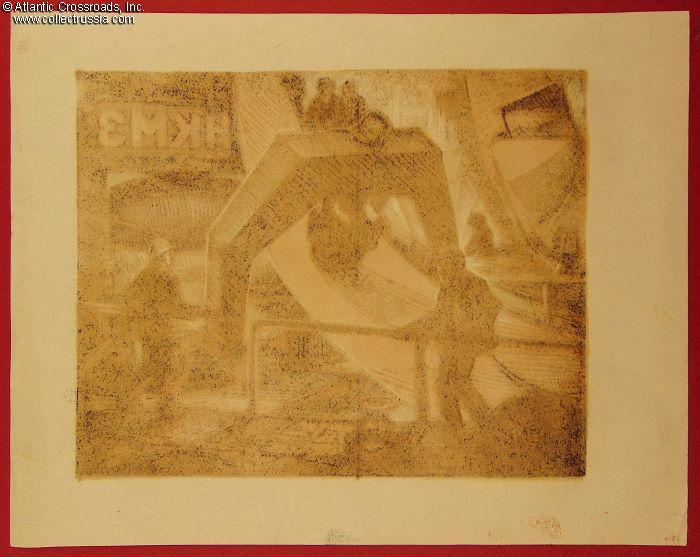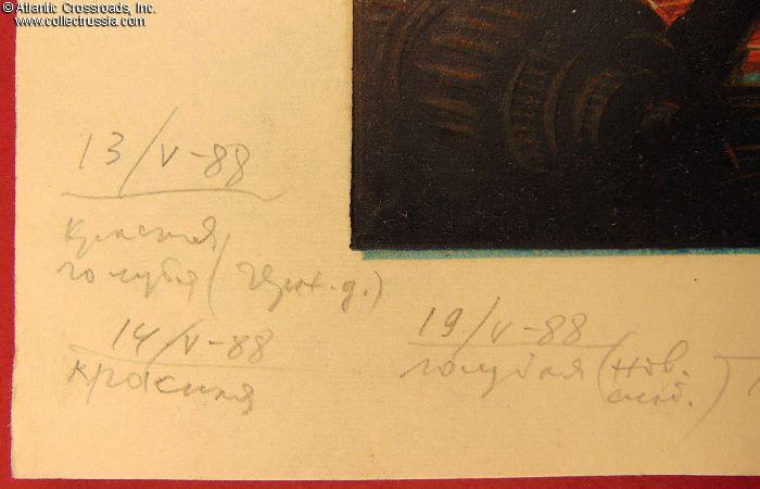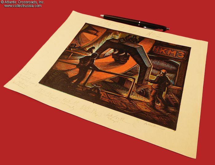 The artwork measures 8" x 6 ¼", the total size of the sheet is 10 ½" x 8". As is the case with most of Novichenko's art, the lithograph depicts a working scene at a large heavy metallurgy or machine-building plant. The artist's hand signature is under the image in the lower right-hand corner. The notations under the image recording the dates when he applied various colors provide a rare insight into the processes that went into creation of this lithograph.