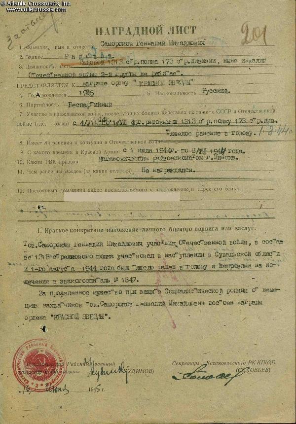 Appointed as a rifleman to the 1313th Rifle Regiment, 173rd Rifle Division, 31st Army, 3rd Belorussian Front, Samarokov took part in the offensive in the vicinity of the city of Suwalki, Poland, one of the follow-up Soviet operations that unfolded on the flanks of the highly successful Operation Bagration. Whether or not his fresh cannon fodder status played any role in it, Samarokov got a severe head wound on 1 August and was sent to Evacuation Hospital #1847. In February of next year, he was discharged from active duty, apparently due to severity of his wound, and transferred to the reserves. On 16 June 1945, the Kaganovich District Military Commissariat of the city of Minsk recommended Samarokov for the Order of the Red Star for his short-lived combat actions. The regional military commissariat downgraded it to the Medal for Combat Service, which was upgraded up the chain of command to the Medal for Valor.