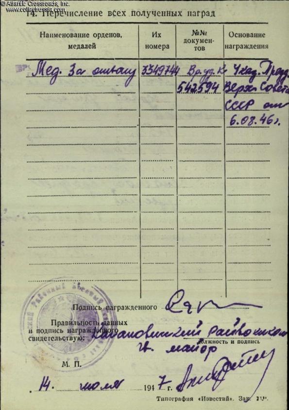 Medical evaluation of Samarokov's condition rated him for 2nd level of disability, but he still found employment after the war. As of July 1947, when his award card was filled out, he worked as a supervisor at a telephone exchange station in Minsk. The Valor Medal, naturally, remained his only decoration of the war.