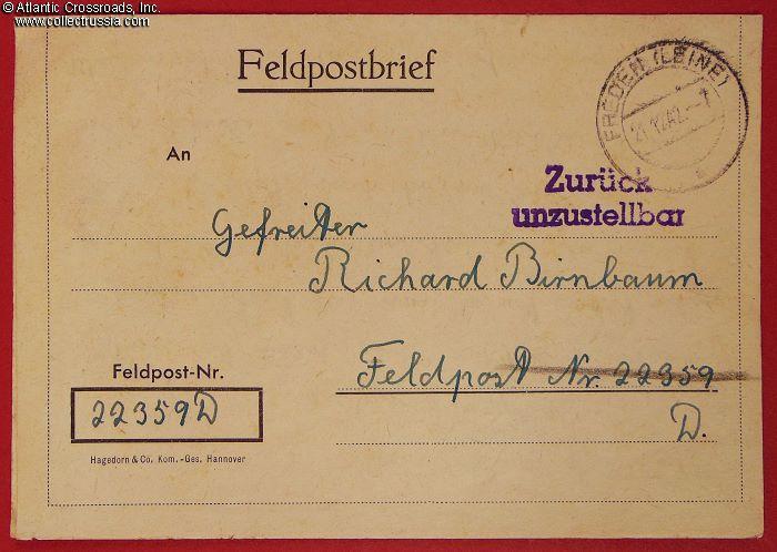 Private Richard Birnbaum, a native of Herne, a city in in North-Rhine Westphalia in the northwest of Germany, was a son of a farmer. Tracking the postal cancels and return addresses of his 1940 correspondence, he was already in the army in February and stationed in Weende, Gottingen, central Germany. From mid-March, the letters have FeldPost 22359 D as the return address. This number was assigned to the 6th Battalion, 171st Artillery Regiment, 71st Infantry Division. From October 1940 to March 1941, it served as a training troop in Konigsbruck. From November 1941 through April 1942, it served in Belgium and France. Then their luck rather abruptly changed.