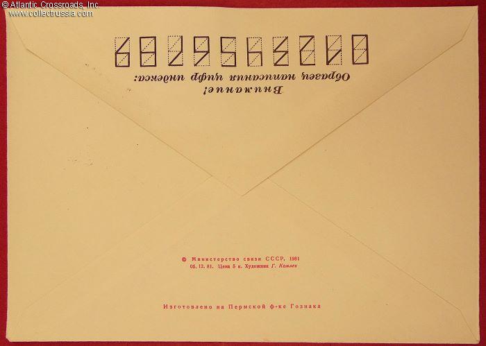 The size is 6 ¼" x 4 ½", published by the Ministry of Communications of the USSR, circulation unknown. The pre-printed postal stamp and the special-issue commemorative stamp are canceled with the First Day stamp issued by the Zhitomir Post Office and dated 12 January 1982.