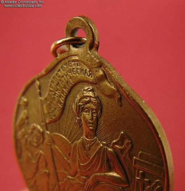 In brass, 32.9 mm tall (incl. eyelet), 25.9 mm wide. The complex shape is less common than the more typical round jettons. The obverse is dominated by a sitting female figure; her chair is inscribed "Free Russia" whereas the flag she is holding in the right hand has the motto "Long Live the Democratic Republic!" To the left of the figure of Russia is a worker breaking her chains on an anvil. A curious feature of this jetton is the maritime motif in the lower right consisting of an anchor, heart and cross. This possibly indicates that the jetton was intended for sailors or port workers. The reverse shows the 1917 date, intricate florals, and the manufacturer's logo "D. Kuchkin Factory, Moscow".