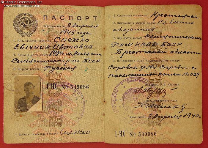 Measures 3 1/21" x 4 ¾", in oilcloth-bound covers. The front cover shows the USSR State Emblem with 11 scrolls, per the number of Soviet socialist republics comprising the Soviet Union from 1937 to 1946. The personal information pages are printed in Russian and Belorussian languages, however, both are filled in in Russian. The passport was issued by the Semyatichi District Police Department of the NKVD of Belorussian SSR, part of the territory of Western Belorussia annexed by the Soviet Union from Poland as per the Molotov-Ribbentrop Non-Aggression Pact between Germany and the USSR. The centerfold page reserved for "Special Notes" has an ink stamp authorizing Evgenia Shezhko to reside and travel within the limits of the village where she lived. In other words, she was prohibited from traveling anywhere. The "Residence Registration" section has a stamp in red ink confirming that she was authorized to live in the village of Melnik, her place of residence.