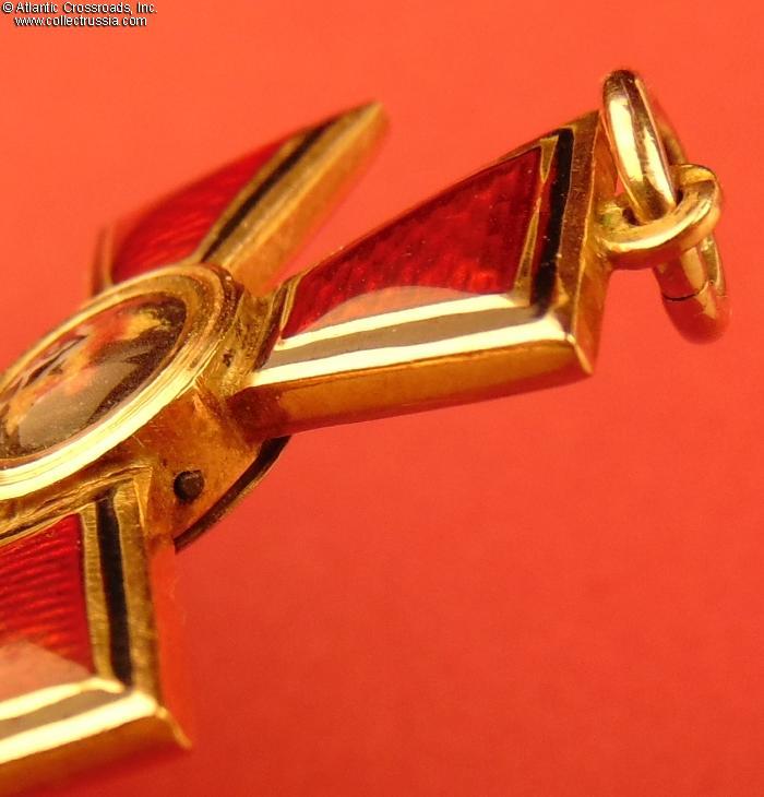 Excellent condition throughout. The red and black enamel on the arms in particular is exceptionally well preserved: it shows a beautiful luster and is completely free of any wear visible to the naked eye; there are only a few microscopic contact marks, all of them totally unnoticeable without magnification. The center medallion on both sides is essentially pristine, with the enamel and artwork perfect and intact. Comes with a connecting loop in what appears to be solid gold (not tested for gold content.)