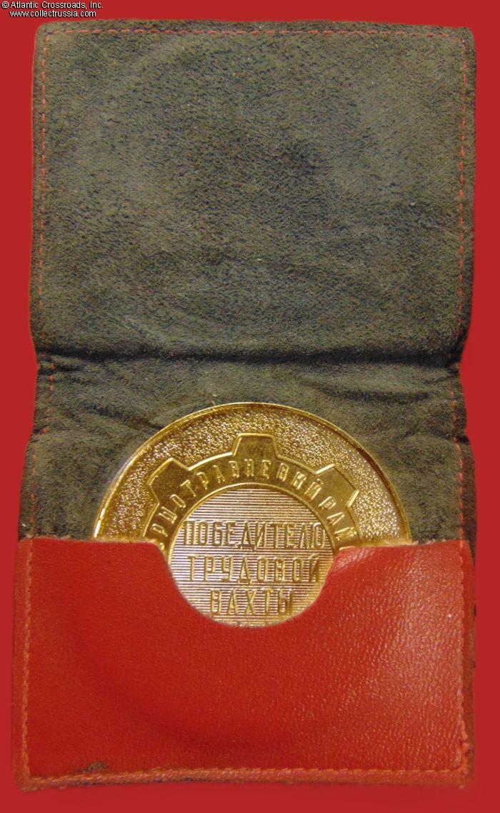 In light metal alloy with gold-colored coating; measures 60 mm across, 3.4 mm thick, weighs 21 g. The lettering in the center of the obverse reads, loosely translated, "To the winner of labor competition, Pervomajskiy District, city of Chernovtsy." The reverse is decorated with industrial symbols surrounding the "XI Five-Year Plan" inscription in Ukrainian language.