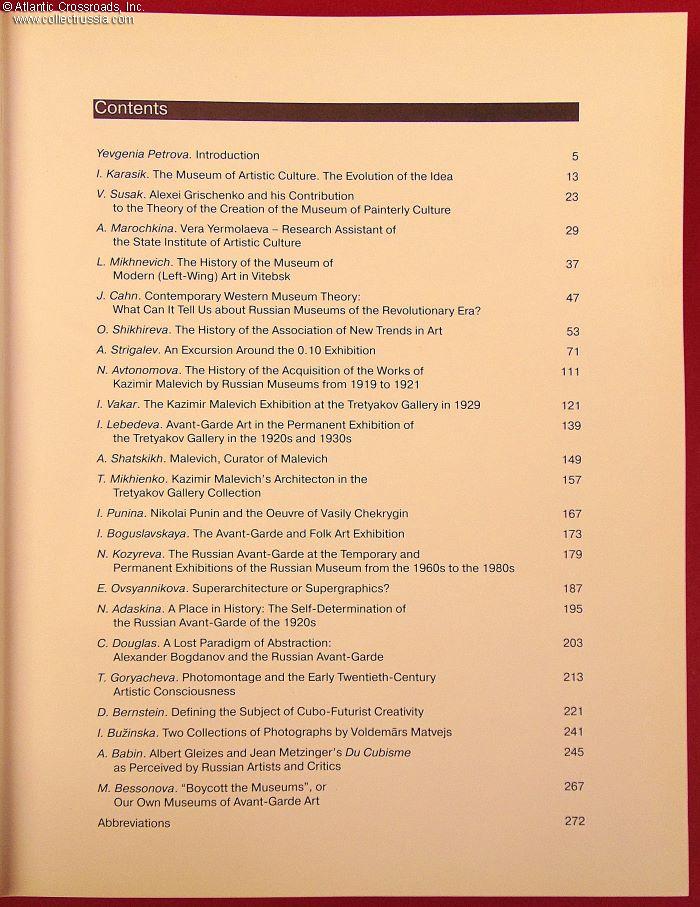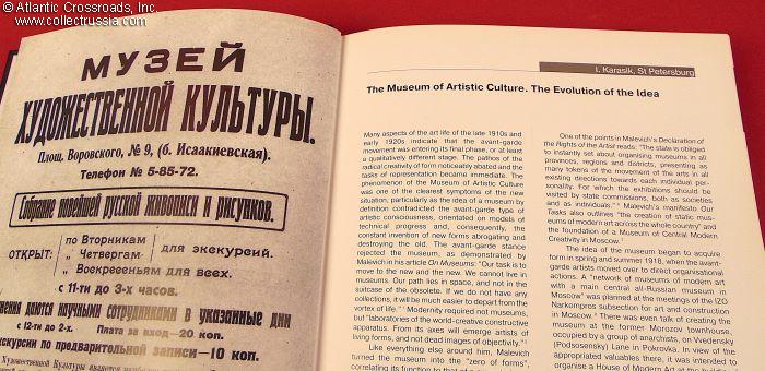 A large and massive tome measuring 8 ½" x 11" x 1" and weighing almost 3 lbs. In laminated hard cover, 272 pp of heavy-stock semi-gloss paper with a large number of high-quality color and b/w illustrations. The book contains 23 academic works from the conference accompanying the 1998 exhibition Museum in a Museum: The Russian Avant-Garde from the Former Museum of Artistic Culture in the Collection of the State Russian Museum.