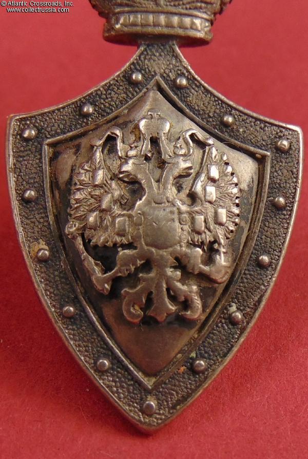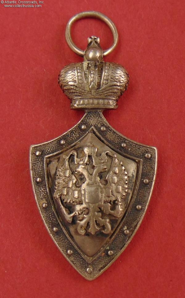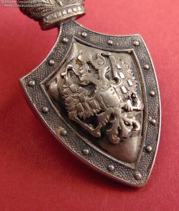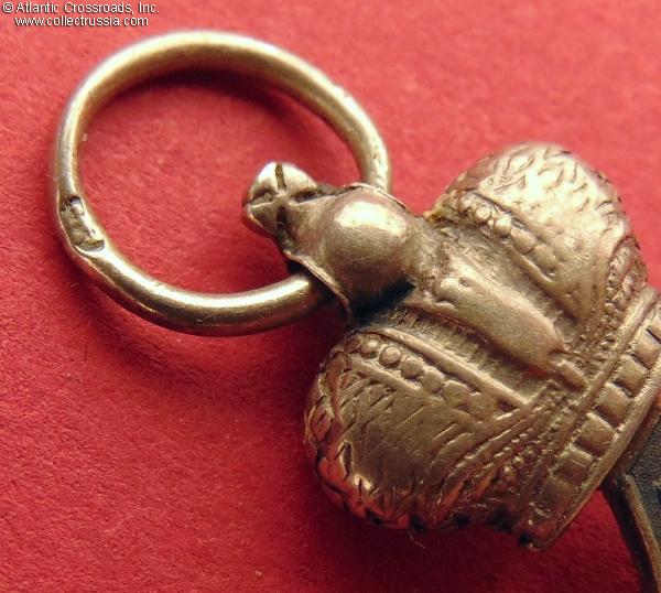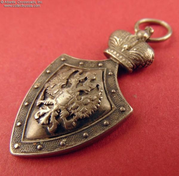 In silver, measures 40.2mm in height not including the jump ring; 21.4 mm in width. The double-headed eagle is a separate superimposed part. The reverse shows the St. Petersburg assay inspection silver hallmark "84" with the anchor and scepter emblem, the style used until 1899. Near the silver hallmark, there is a poorly struck and illegible maker mark.