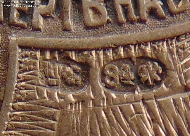 Beside the "camouflaged" name, the jetton is in excellent condition. There is only a very light wear to the raised points of the crown and double-headed eagle, but the details are overall very well-preserved and crisp. There are no dents, significant dings or edge knocks. The silver jump ring is original and shows a matching St. Petersburg hallmark of the anchor and scepter.