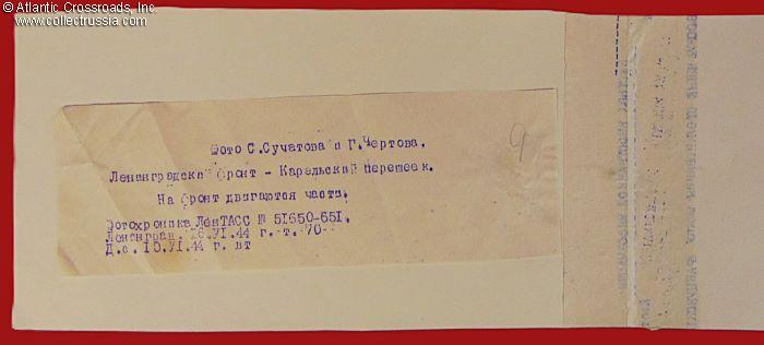 This is a panorama consisting of two photos "stitched" together. The archival paper tag glued to the verso states that the photo was taken by S. Suchatov and G. Chertov at the Karelian Isthmus, Leningrad Front, on 16 June 1944.