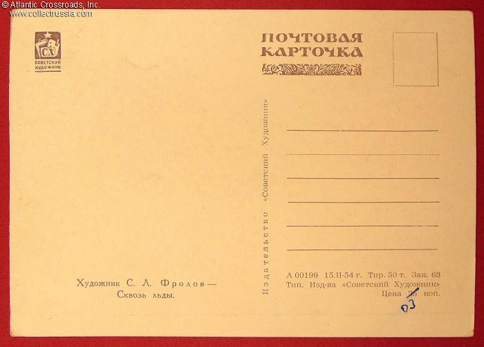 The size is continental standard 6" x 4", postally unused and unmarked; published by the Soviet Artist Publishing House, circulation 50,000, quite small by Soviet standards. The artwork is an offset print of the painting by S. Frolov, depicting an ice breaker cutting a clear water path for the transport ships behind it. It appears that the artist took a generalized approach without too much care for recognizability of the icebreaker, or the ship in the foreground which, for some reason, is cutting its own path through the Arctic ice. The Soviet Union did have plans in the mid-1930s to build an icebreaker Kirov (see the name on the lifebuoy) but scrabbed the project in favor or naval warships.