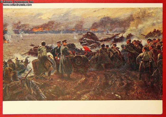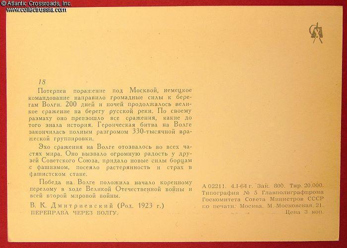 The size is continental standard 6" x 4", unmailable without a cover, published by the Soviet Artist Publishing House, circulation 20,000, very small by Soviet standards. The artwork is an offset print of a painting by V. Dmitrievskiy. The postcard is probably part of a series, with a descriptive annotation on the verso. Note that, probably as a side effect of Krushchev's campaign against Stalin's personality cult, there is no mention of Stalingrad in the annotation. Instead, the Battle of Stalingrad is described as "a great battle on the banks of the Russian river."