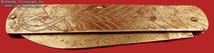 In steel, the handle measures 5" long, the blade is 3 ½" long. The maker's mark АИМ is the Russian abbreviation for Workshop of Invalids "Metallist" in the city of Gorky, modern-day Nizhniy Novgorod. The stamped "1 СОРТ" on the handle next to the tang is the top quality rating by Quality Control. The handle is engraved on both sides with the Soviet hammer-and-sickle emblem and a stalk of wheat. Inexpensive and simple, these knives were colloquially called "the collective farmer's knife." Workshops like the "Metallist" were a lifeline to many Sov