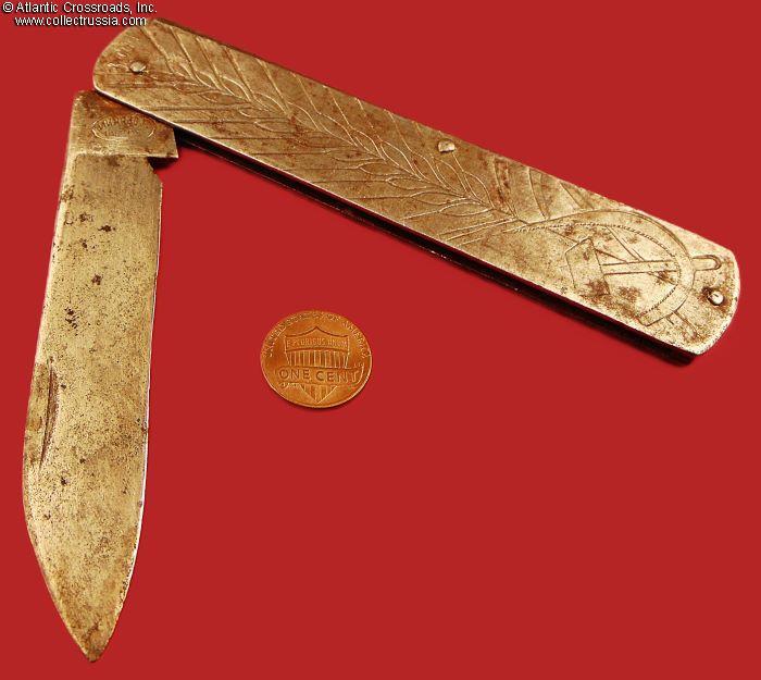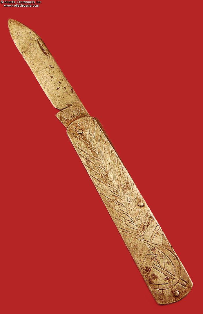 Steel Folding Knife With Engraved Artwork, by Metallist Invalids Workshop, circa 1940s-50s.