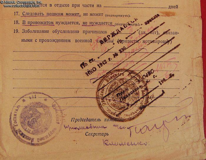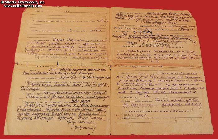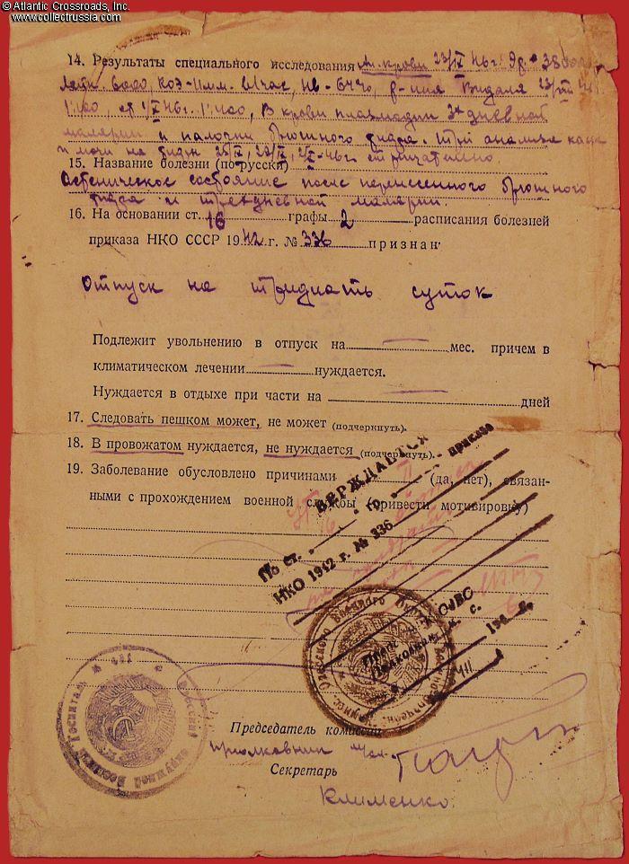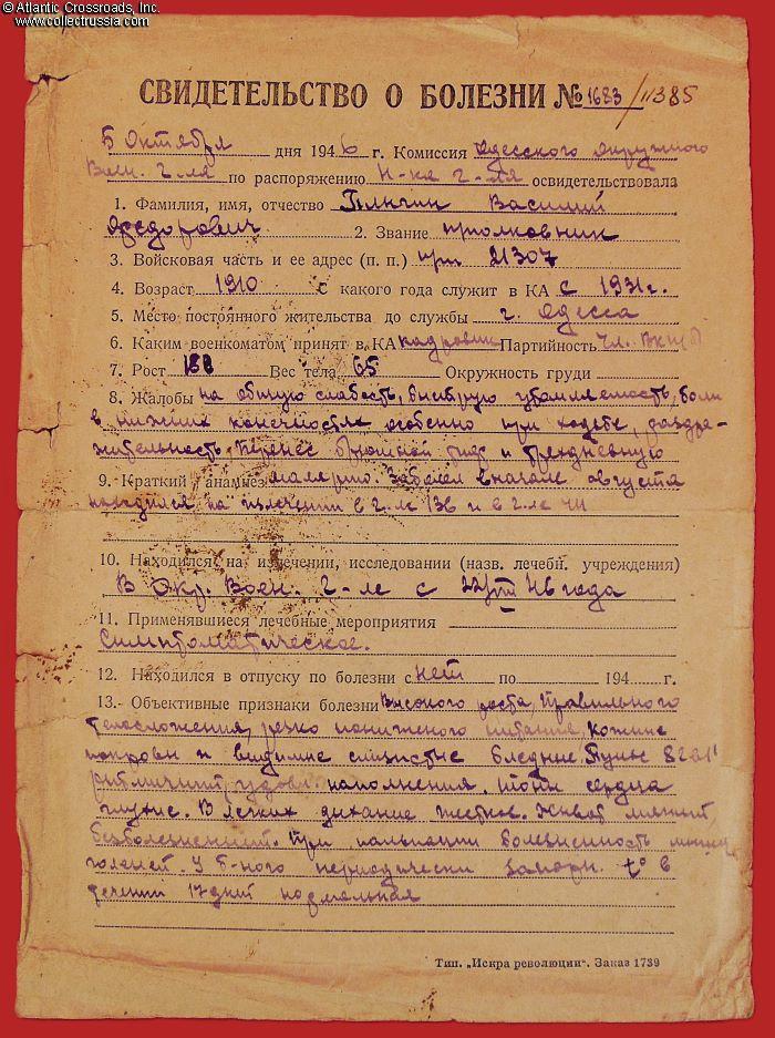Health Status Report, 5 October 1946, completed by a commission of the Odessa Military District hospital. By that time Pligin had the rank of lieutenant colonel and, judging by the commission's findings, was not in good health. Complaints included weakness, fatigue, pains in his legs, irritability, and some others. Bloodwork showed traces of typhus and malaria. Based on their findings, the commission prescribed a month-long furlough which was approved by the Medical Commissar of the Odessa Military District.