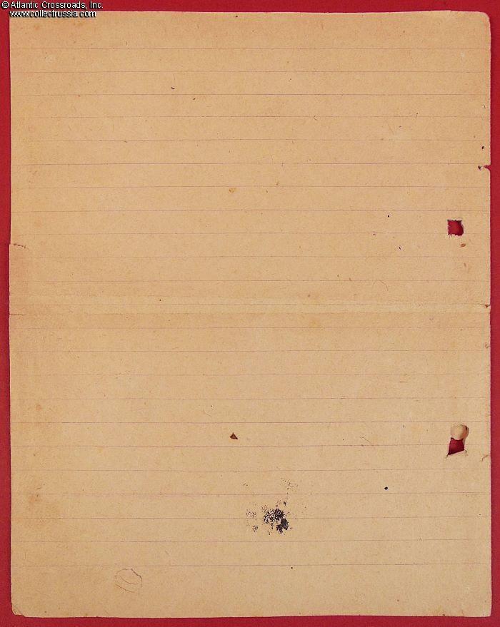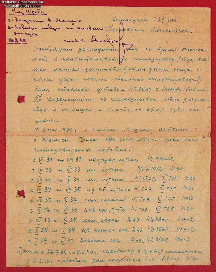 Report to Commander of the 169th Reconnaissance Aviation Regiment. Two pages from a notebook, 6 ½" x 8 ¼". Pligin reported that he had been sent on a "government assignment" in July 1939 and, upon return on 8 June 1940, could not find his flight records which he had left with the staff of the 42nd Long Range Bomber Regiment. Pligin meticulously listed his entire service record as a pilot: dates, his position, military unit and, types of planes he flew and the number of daytime and nighttime flight hours. He concluded with a reques