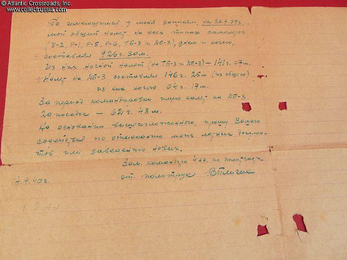 Report to Commander of the 169th Reconnaissance Aviation Regiment. Two pages from a notebook, 6 ½" x 8 ¼". Pligin reported that he had been sent on a "government assignment" in July 1939 and, upon return on 8 June 1940, could not find his flight records which he had left with the staff of the 42nd Long Range Bomber Regiment. Pligin meticulously listed his entire service record as a pilot: dates, his position, military unit and, types of planes he flew and the number of daytime and nighttime flight hours. He concluded with a request to locate his original flight record documents or issue a new set of them.