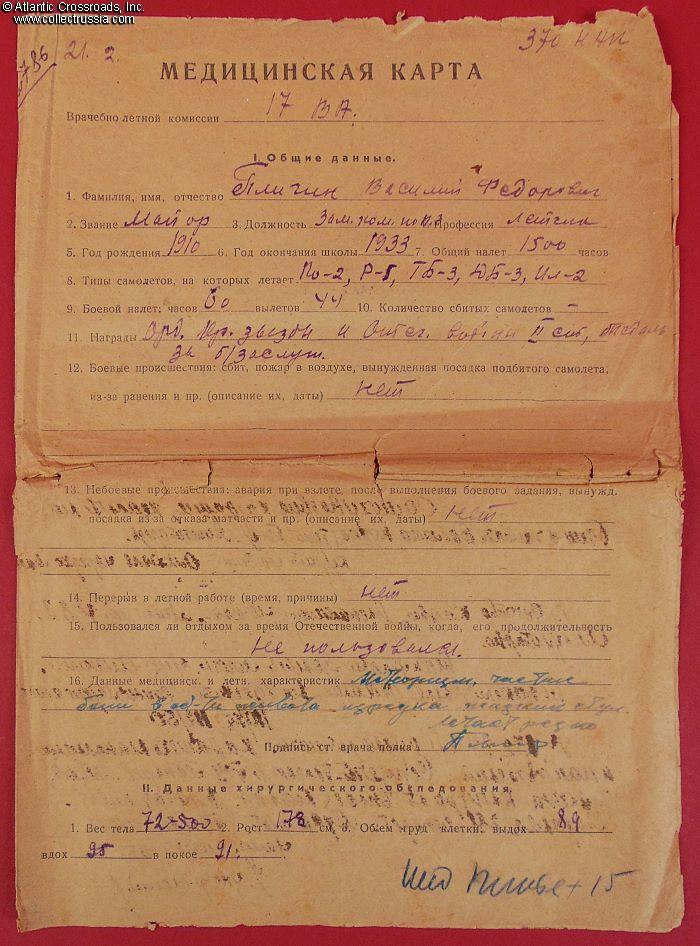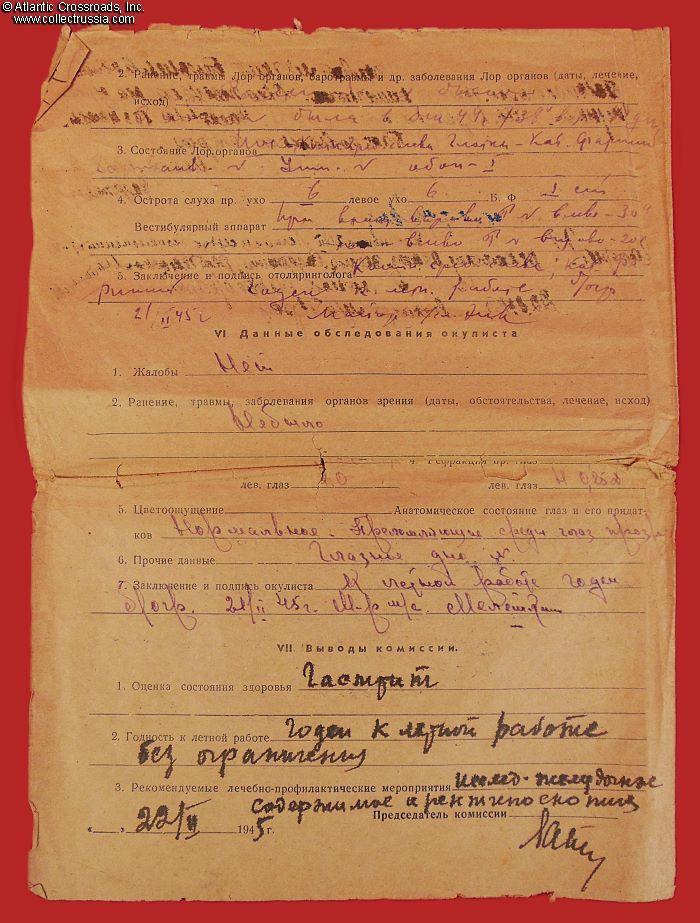 Health Status Report compiled by the medical commission of the 17th Air Army, recording a comprehensive examination of Pligin's physical condition performed at the end of February 1945. The commission included a surgeon, neurologist, psychiatrist, otolaryngologist, and ophthalmologist. The commission concluded that Major Pligin had gastritis and was fit for piloting airplanes.