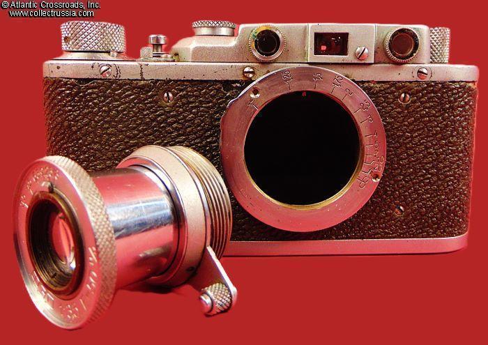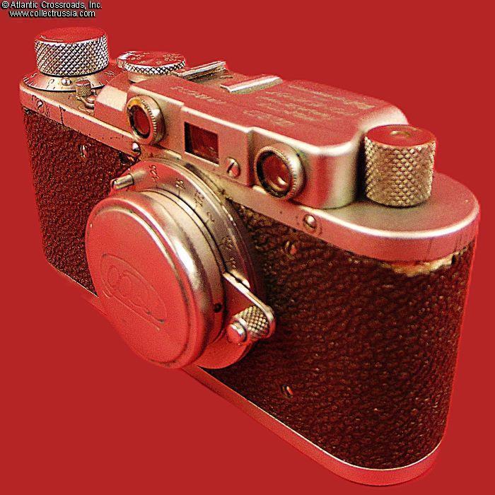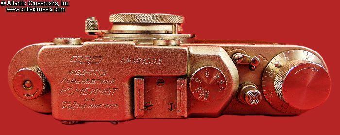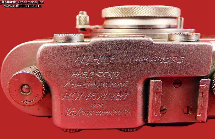 The camera measures approx. 5 ¼"(W) x 2 ¾"(H) x 1 ½"(D with the lens collapsed). Weighs a little over 1 lb. Manufactured by the Kharkov Felix Dzerzhinsky Factory, Ukraine. The original lens cap is lined with short-pile velvet on the inside. This is the first model which did not have the model number next to the FED trademark. There were several modifications of the first model. The engraving on the top part literally translates as "FED, NKVD-USSR, Kharkov Enterprise named after F.E.Dzerzhinsky." The serial number 121595 falls into the range assigned to cameras made in 1940. This modification is also known as "Commander's FED."