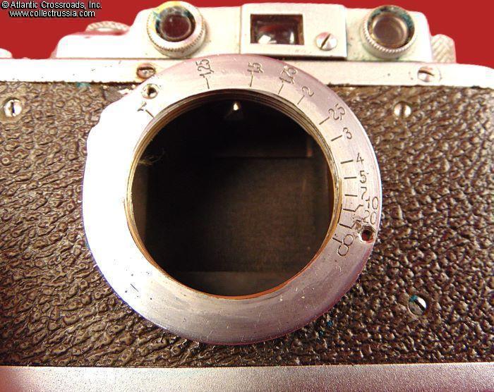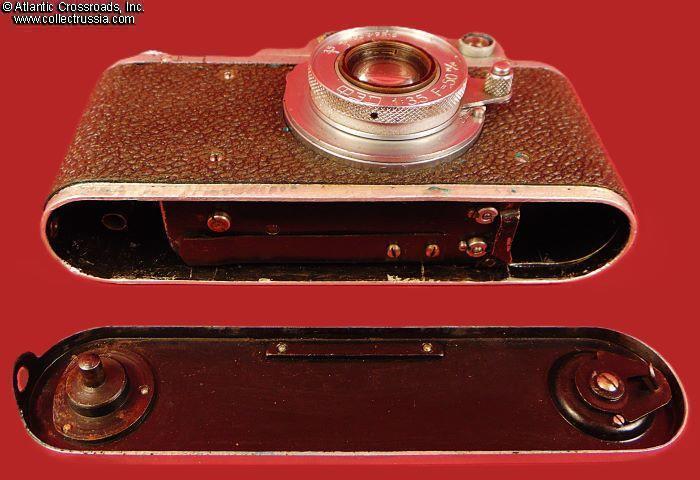 The camera measures approx. 5 ¼"(W) x 2 ¾"(H) x 1 ½"(D with the lens collapsed). Weighs a little over 1 lb. Manufactured by the Kharkov Felix Dzerzhinsky Factory, Ukraine. The original lens cap is lined with short-pile velvet on the inside. This is the first model which did not have the model number next to the FED trademark. There were several modifications of the first model. The engraving on the top part literally translates as "FED, NKVD-USSR, Kharkov Enterprise named after F.E.Dzerzhinsky." The serial number 121595 falls into the range assigned to cameras made in 1940. This modific