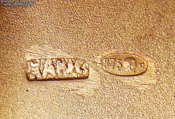Measures 107 x 86 x 17 mm, weighs 146 g. The cabochon thumb piece is in green polished glass. The artwork is colloquially known among Russian collectors as The Banner of the Soviet State. Both sides show a silver hallmark "875" with a worker's head, the kind used from 1927 to 1954, and the maker's mark ХАЮС ("KhaYuS", Art and Jewelry Workshop in Moscow). The maker's mark is struck poorly but is still easily recognizable. In 1967, this manufacturer merged with several other workshops forming the Moscow Jewelry Factory with the trademark МЮЗ ("MYuZ", the Russian abbreviation of the name of the factory). The interior of the panels is gilded. The outer back panel is completely free of patina or other wear. Perhaps it had an engraved inscription that was later erased.
