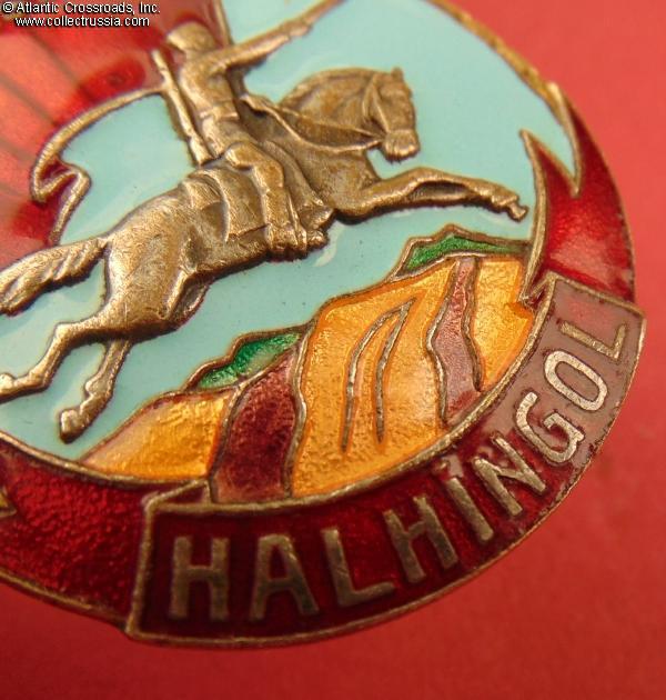 In very fine to excellent condition. There are no significant flaws. The red enamel appears practically perfect to the unaided eye and retains beautiful luster. A careful examination however reveals a couple of tiny surface flakes in the upper right corner and along the top edge of the banner, all of them nearly unnoticeable without magnification. There are also a few minuscule contact marks on the banner and a few microscopic flakes along the lower edge of the red plaque with the inscription "Halhingol". The turquoise enamel in the center is perfect, and so is the beautiful gold-green-and-purple enamel representing the steppe. To reiterate, the enamel on the badge is very well preserved overall, and most of the wear to the red enamel is nearly invisible without magnification.