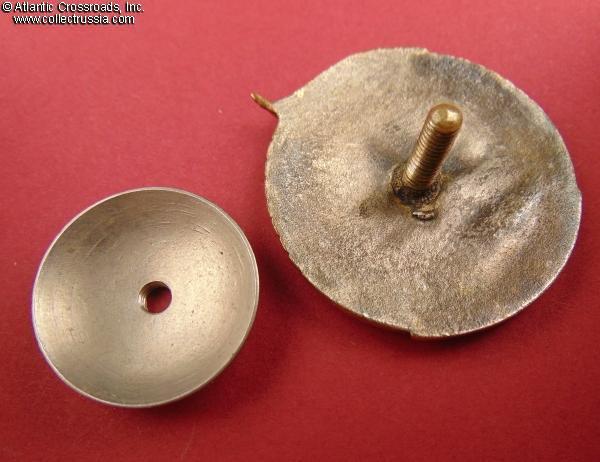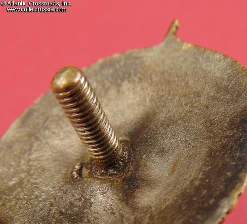 The details of the cavalryman and his horse are perfect and exceptionally crisp; the silver plating is almost pristine, showing only the tiniest, barely detectable wear to the high points of the artwork. The screw post is full length, nearly 14 mm, and although slightly bent, remains fully functional. Included is an original period screw plate with the Soviet mint logo.