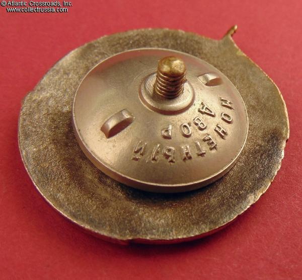 Silver-plated brass, enamels. Measures 37.9 mm in height from the bottom to the top of the 12 o'clock point of the banner (not including the flagpole finial), 37.2 mm in width; weighs 15.3 g, not including the screw plate. This is a Variation 2 badge featuring flat reverse, the Sub-variation 1 with a relatively smooth ornamental edge. The fine quality of this badge is very characteristic of Soviet Mint manufacture.