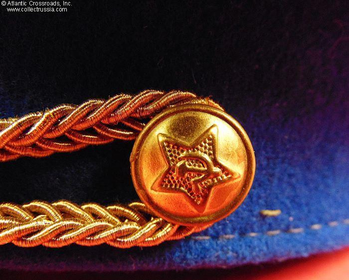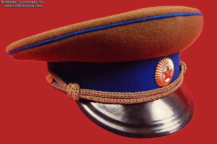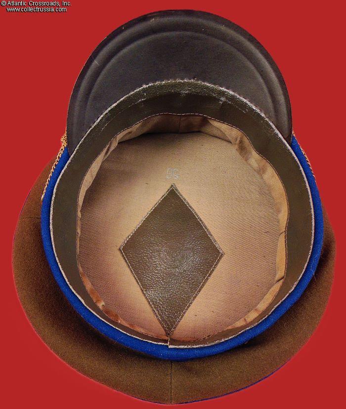 In napped olive drab wool with royal blue piping and band. Early style small rounded visor and distinctive smaller crown. The officer hat badge is of the early type, in brass and high-quality enamels. Complete with gold chin cord. The sweat diamond has a logo of the Moscow Krasnyi Voin ("Red Warrior") Headgear Factory and shows the 1957 date of manufacture. The stamped logo and lettering of the sweat diamond is very indistinct and hard to read, becoming somewhat legible only at a certain angle to a bright light. The liner is marked size 56 (US 7 / Medium). The inside of