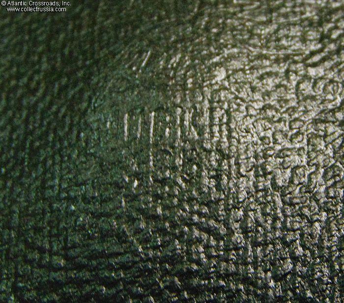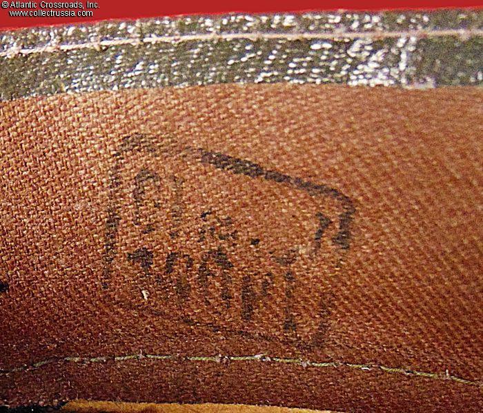 In napped olive drab wool with royal blue piping and band. Early style small rounded visor and distinctive smaller crown. The officer hat badge is of the early type, in brass and high-quality enamels. Complete with gold chin cord. The sweat diamond has a logo of the Moscow Krasnyi Voin ("Red Warrior") Headgear Factory and shows the 1957 date of manufacture. The stamped logo and lettering of the sweat diamond is very indistinct and hard to read, becoming somewhat legible only at a certain angle to a bright light. The liner is marked size 56 (US 7 / Medium). The inside of the sweatband has a rectangular Quality Control stamp in black ink.