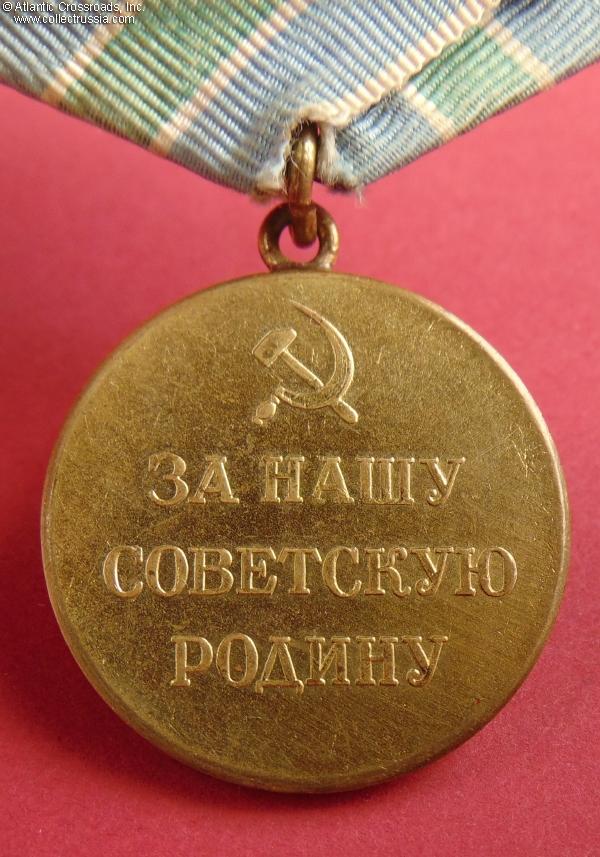 The medal comes on the original suspension device, a WW2 double-layer model in steel with a self-locking pin. The perfectly clean ribbon is old, possibly original to the medal. The connecting link appears to be of the period. This superb example of the Soviet Variation 1 Polar Region Medal is the best we've had in years and in our opinion, literally impossible to upgrade.