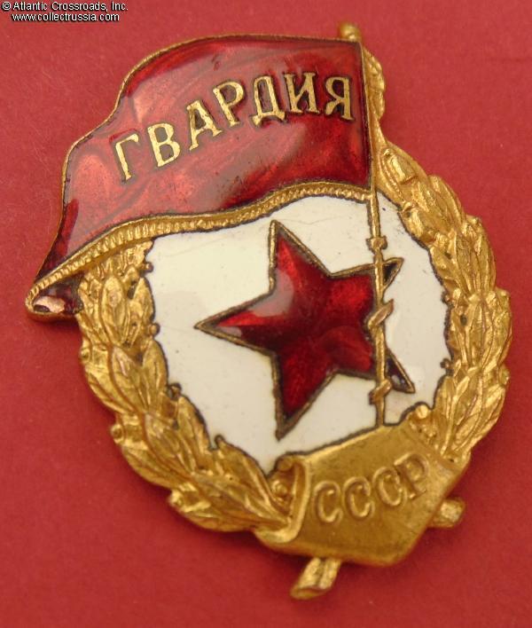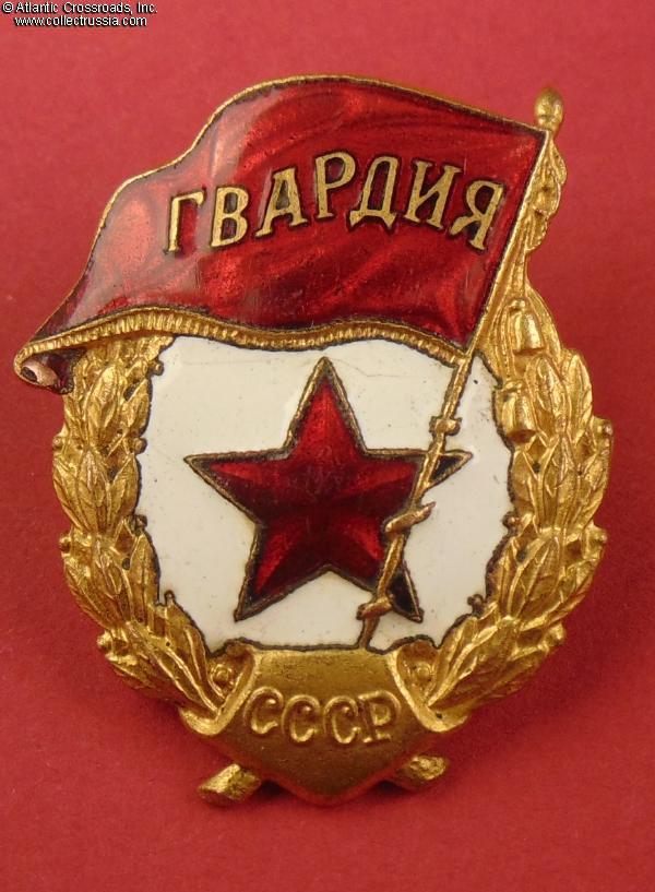 Brass, enamels; 44.3 x 36.3 mm; weighs 16.0 g without the screw plate. One of the early post-war issues made by the ShMZ / MPS (formerly NKPS) Factory. The flag is of the shape distinctly different from the later variations. There is a sharply defined moiré pattern under the red enamel. The badge is of the model established in 1950 and issued only until 1951, at which point the issuance of Guards Badges was temporarily suspended (the practice of wearing Guards badges in the Soviet armed forces resumed only a decade later, in 1961.) This variation is rated 4 (scarce) by Airapety