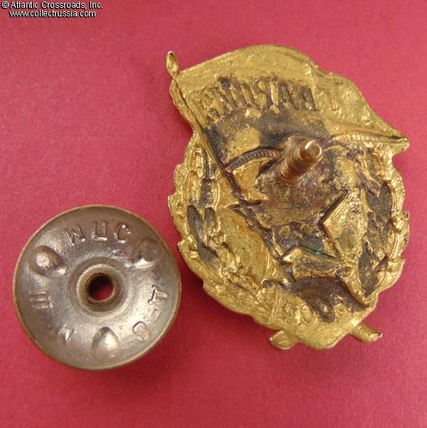 The details of the wreath are exceptionally well-preserved and crisp, practically pristine. The gilt finish is very bright and free of tarnish. The finial of the banner is not bent as is often the case. The screw post is full length, approx. 10 mm, and includes original screw plate in nickel-plated steel maker-marked "ShMZ-d MPS".