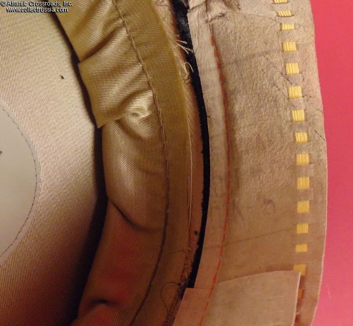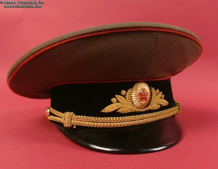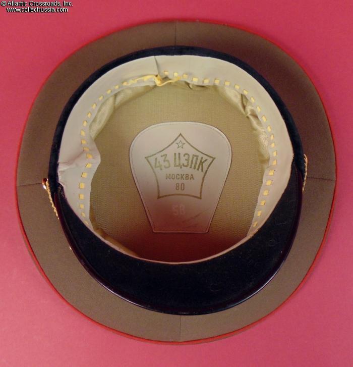 In olive drab wool gabardine with black velvet band and red piping. Gold filigree chin cord. Gold embroidery around the hat badge, patent leather visor with felt underside. Yellow silk tape threads through the leather sweatband to allow a customized fit, a feature unique to general officer hats. The two-piece hat badge is likewise the type specific to generals. Moscow TsEPK factory's leather sweat label shows a 1980 date of manufacture and size 58 (US 7 ¼ - Large). There is a quality control stamp to the suede underside of the sweat band.