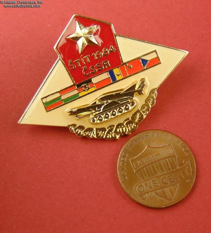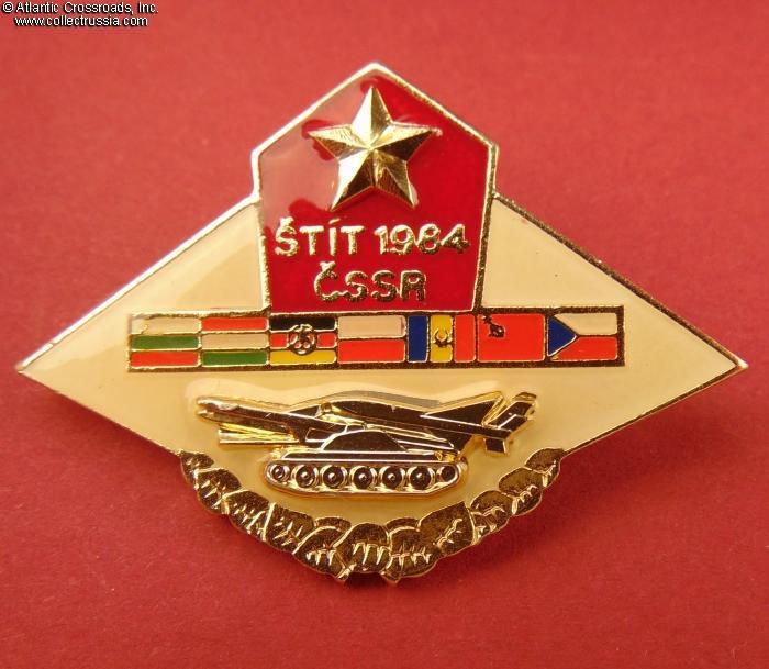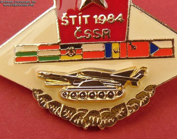 Manufactured in Czechoslovak Socialist Republic. The badge was issued to officers who took part in the large-scale Warsaw Pact war games in 1984, at the height of the Cold War tensions (at the time, the Soviet high command had become paranoid about the possibility of a first nuclear strike by NATO, and the world had come as close to nuclear war as ever). The version with a beige background is far more scarce than the one with the red background.