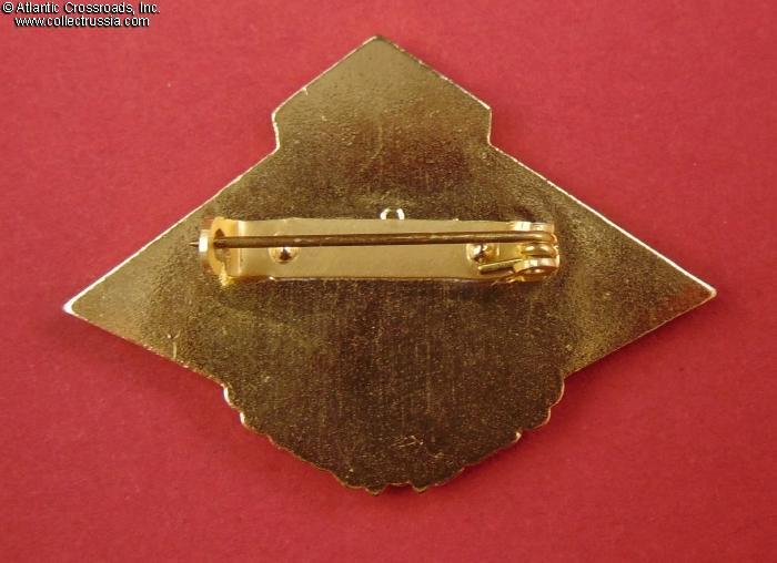 Excellent condition. The lacquer and anodized gold finish are pristine. The pin attachment is intact and fully functional.