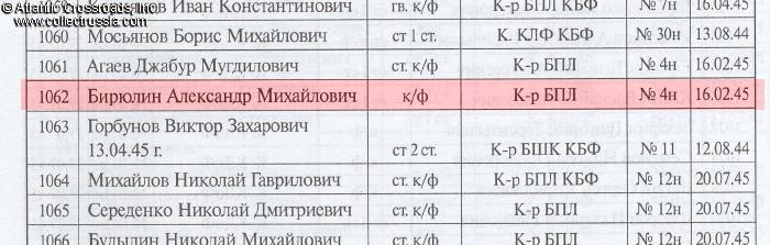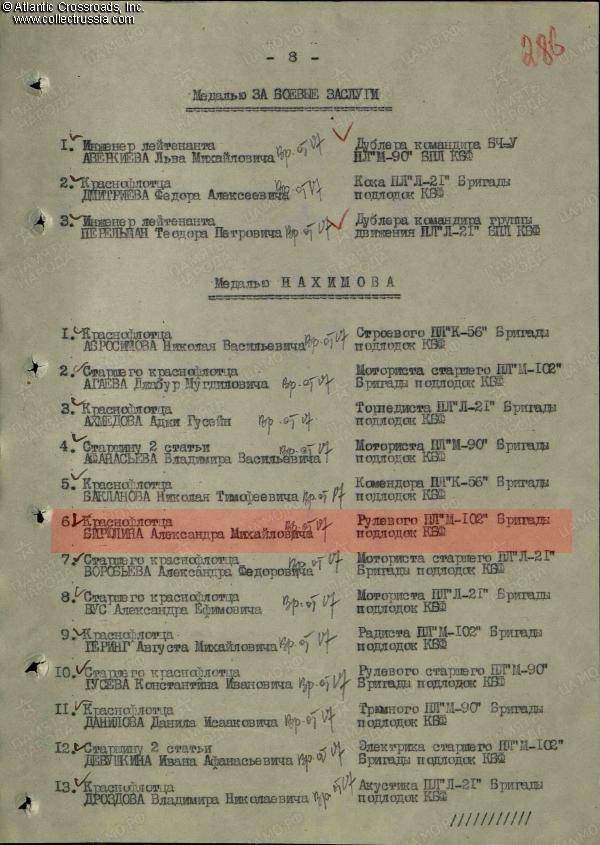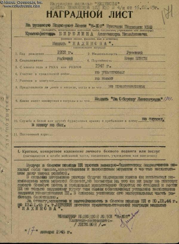Private Seaman Biryulin proved a worthy member of the M-102 crew throughout her wartime ordeals. According to the award commendation for the Nakhimov Medal submitted by the sub's commander Nikolay Leskovoy on 17 January 1945, Biryulin constantly exhibited bravery and endurance in combat, and "honorably fulfilled his obligation to the motherland". In stormy weather, he steadfastly carried out his duty of a helmsman despite experiencing "incredible torments of sea sickness" as the small boat was tossed about by the waves. Biryulin also made sure that the equipment in his care always functioned flawlessly. He thus ensured that the submarine was able to complete her assignments. The commendation particularly emphasized Biryulin's excellent service during the combat patrol in the mouth of the Gulf of Finland from 30 December 1944 - 13 January 1945. On 16 February 1945, Biryulin was awarded with the Nakhimov Medal by the order of the Commander of the Submarine Brigade, Baltic Fleet.