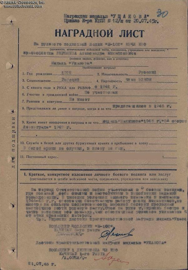 On 21 July 1945, Biryulin was recommended for his second decoration, the Ushakov Medal, for his outstanding performance during M- 102's last combat patrols of the war in the winter of 1944-45. Once again, the submarine commander's recommendation mentioned Biruylin's fortitude in remaining at his post despite suffering from severe sea sickness. It also mentioned that his flawless execution of commander's orders allowed the sub to evade the attacks of enemy speedboats - apparently referring to the incident in the pre-dawn hours of 27 February, when the M-102 was counterattacked and depth-charged by a group of German speedboats near the city of Windau (now Ventspils, Latvia) and barely made her escape. It is interesting to see that the Ushakov Medal (#4157) was officially bestowed upon Biryulin on 20 July 1945 - i.e. a day before the "post-factum" award recommendation, as it sometimes happened during the war. Biryulin was discharged from the active duty in May 1948 upon completing six years of uninterrupted naval service. Beside the Nakhimov and Ushakov Medals, he was awarded with Medals for the Defense of Leningrad and Victory over Germany, as well as the 1985 "jubilee" issue of the Order of the Patriotic War.