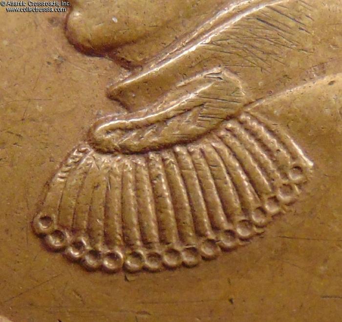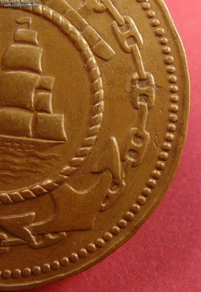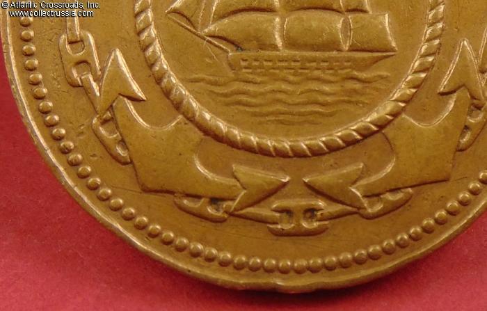 The medal is in fine condition. There are a moderate wear and scratches - most likely, from careless cleaning - to the raised points of the bas-relief portrait, but most of its details are still well-defined. The medallion also shows numerous small dings and contact marks throughout. There are two mild bumps to the edge at approximately 7 and 10 o'clock positions, not too glaring. Very attractive even patina to brass on both sides, free of blemishes or oxidation spots, while traces of the original "gilt" mint luster are still visible in recessed areas, especially on the reverse near the anchor and anchor chain. The eyelet shows heavy wear but remains sound.