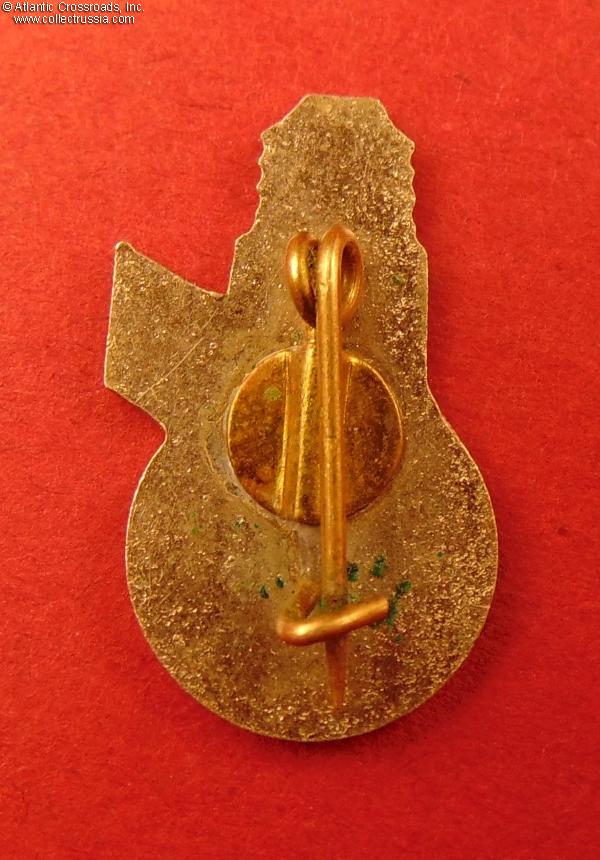 Nickel-plated brass, enamels; measures 21.7 mm x 13.4 mm wide. The plaque in the center with the national flag of Latvian SSR shows the Latvian acronym of the factory's name.