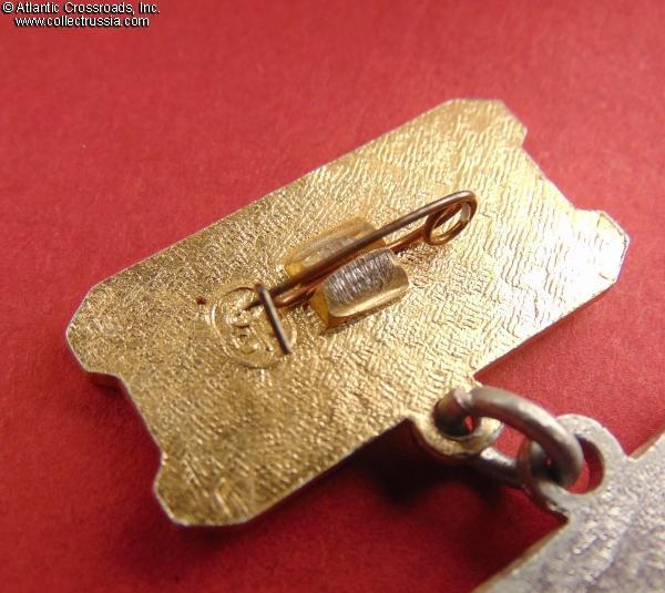 Aluminum, paint, lacquer. The pendant is of two-piece construction with superimposed central disc; measures 32.8 mm in height x 29.9 mm in width; overall height with suspension is approx. 51 mm. The reverse of the suspension shows the stylized raised logo ФСС ("FSS") of the Experimental Factory of Sports Souvenirs and Badges in Moscow. An impressive badge in excellent condition.