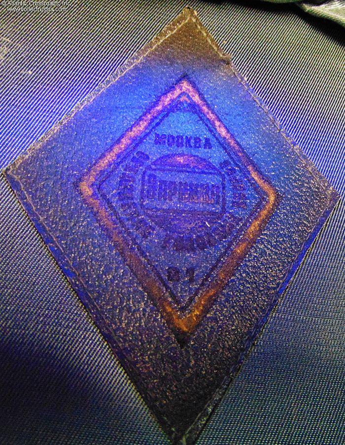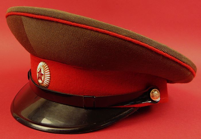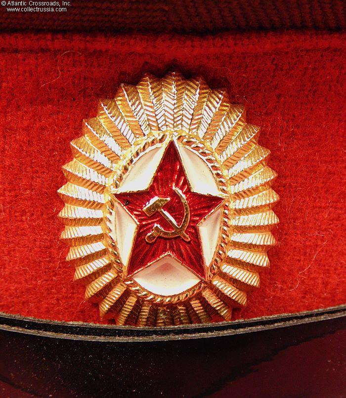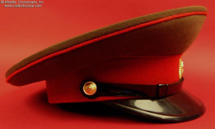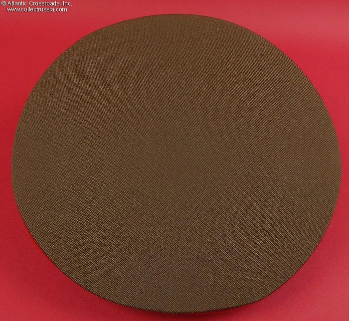 The crown is in olive drab gabardine with red cloth band and red piping. Includes the appropriate NCO black plastic chin cord and dress cockade. The sweat diamond of the Moscow's Zarnitsa Factory shows a 1981 date of manufacture. Size 58 (US Size 7 ¼ / Large) is stamped in white under the sweat diamond. There is a factory quality control stamp to the underside of the sweat band.